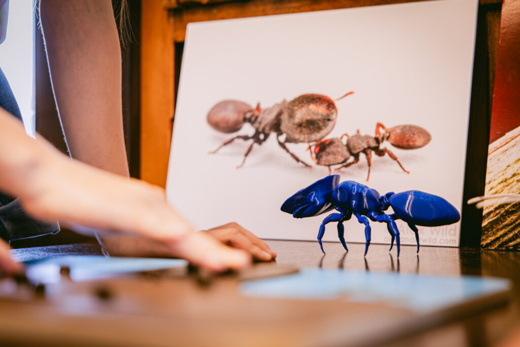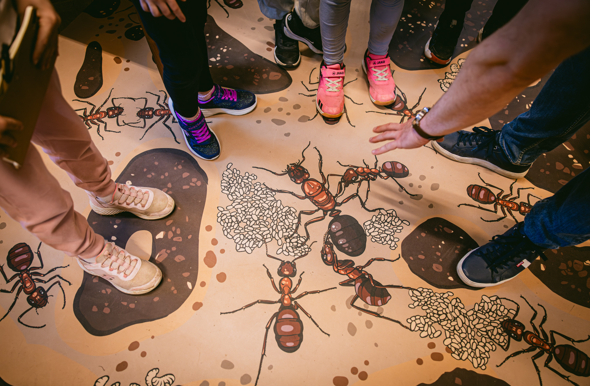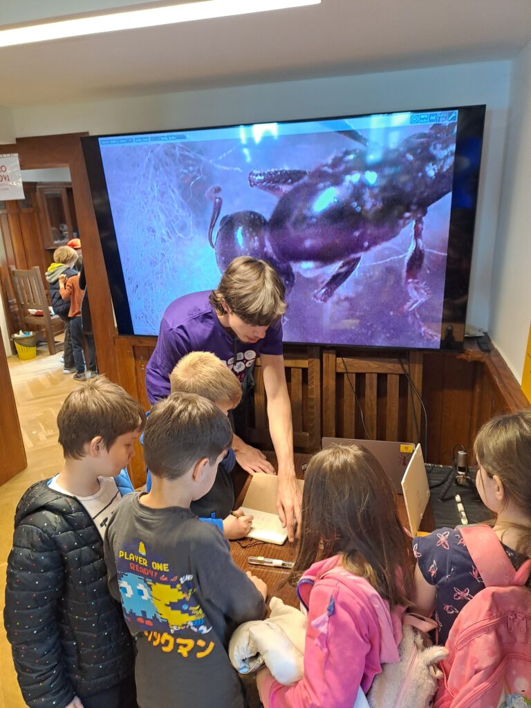 Naša postaja „Zakoračite u živi mravinjak“ bila je dio rute B, namijenjene učenicima od 1. do 3. razreda osnovnih škola. Naši Lara, Toni i Dario proveli su dan objašnjavajući učenicima životni ciklus mrava, život u koloniji, a učenici su mogli vidjeti i maticu vrste maticu vrste sjemenojednih mrava (Messor wasmanni) pod kamerom kako brine za svoja jajašca te cijele mravlje kolonije s maticama, radilicama i njihovim jajima i ličinkama.
